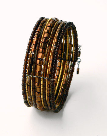 Descriptif : Bracelet manchette rigide. Perles mélangées marrons et ocre.. Largeur 3,5 cm env. Diamètre 6,5 cm env. Matière : - Coloris : marron Taille : -