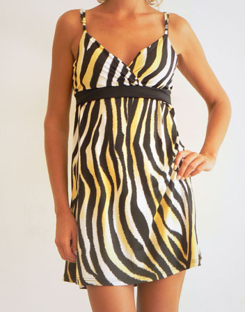 Descriptif : decolleté croisé en V fines brettelles réglables se noue dans le dos longueur : 86 cm environ Matière : 100% polyester Coloris : jaune, blanc et noir Taille : convient aux 36, 38 et petit 40.